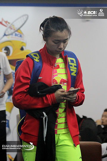 Tian Qing (Tiongkok) asik bermain handphone seusai bertanding