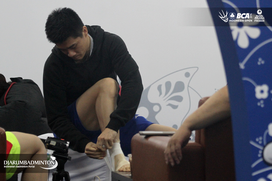 FU Haifeng (Tiongkok) memakai taping sebelum bertanding