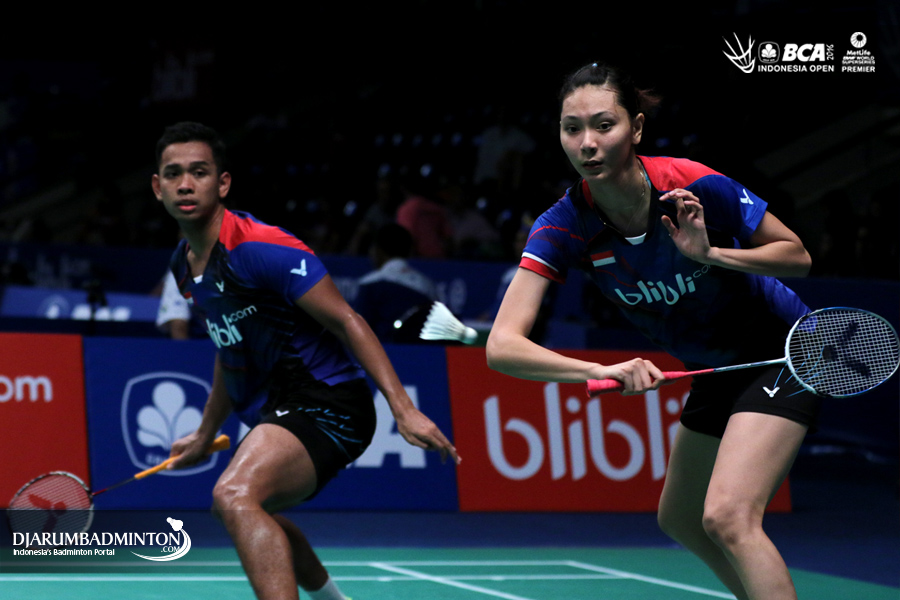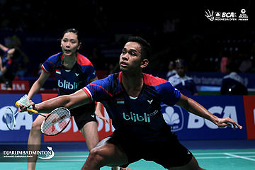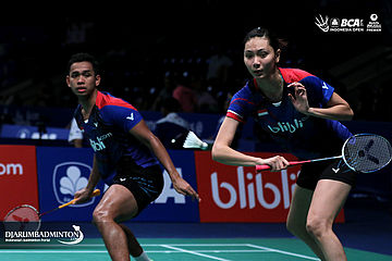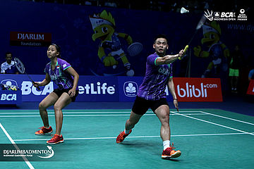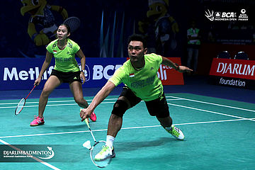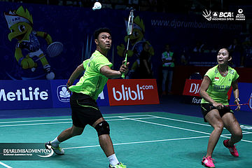 Ardiansyah Putra/Devi Tika (Indonesia) mengembalikan shuttlecock