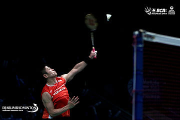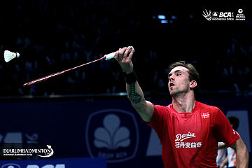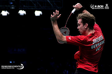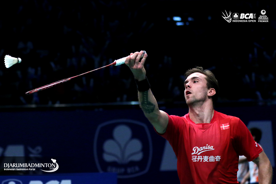 Jan O Jorgensen (Denmark) mengembalikan shuttlecock