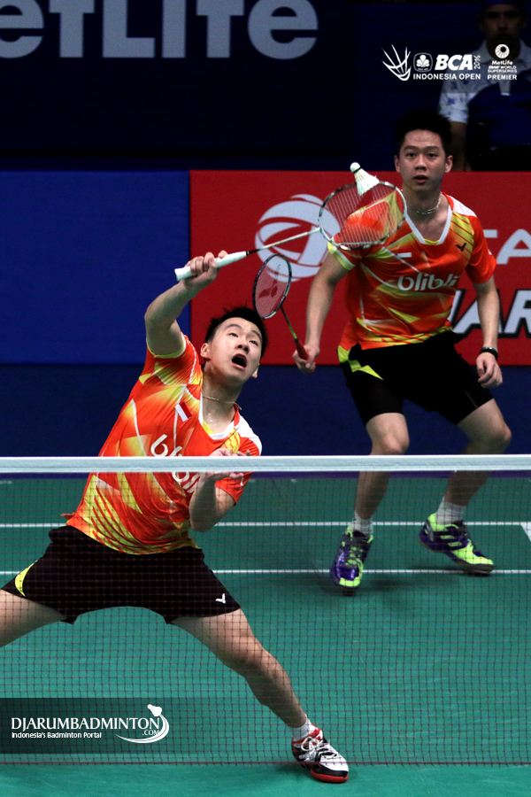 Kevin Sanjaya/Markus Fernaldi Gideon (Indonesia) mengembalikan shuttlecock