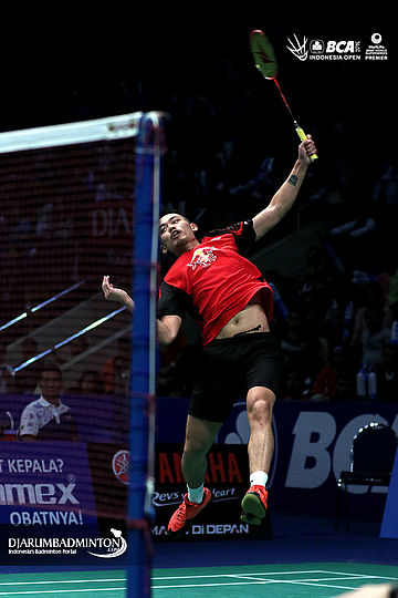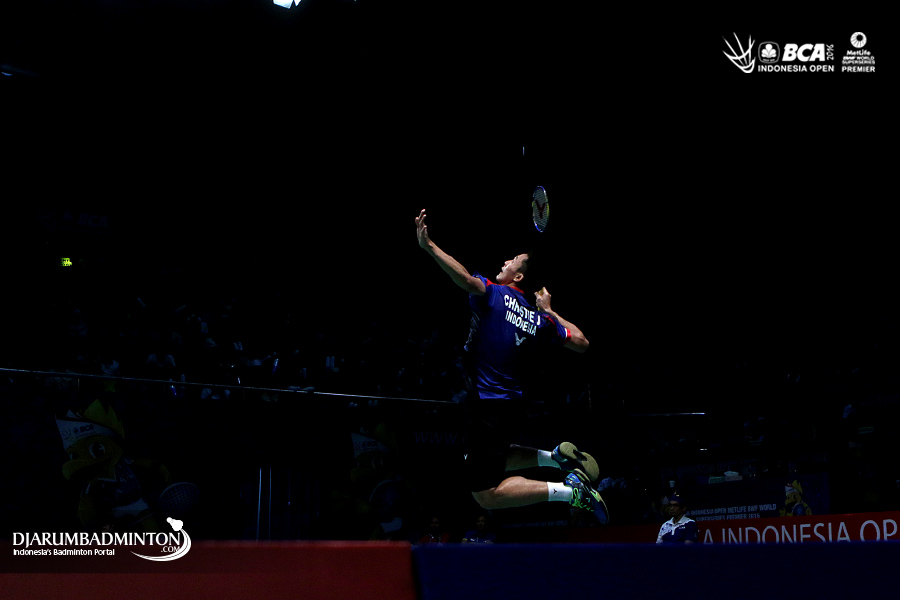 Jonathan Christie (Indonesia) melepaskan jumping smash