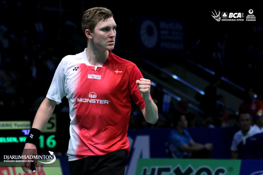Viktor Axelsen (Denmark) mengembalikan shuttlecock