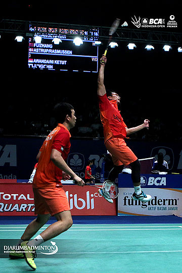 Hendra Setiawan/Mohammad Ahsan (Indonesia) melepaskan serangan
