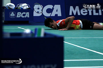 Tontowi Ahmad (Indonesia) harus terjatuh saat berusaha menyambut pengembalian