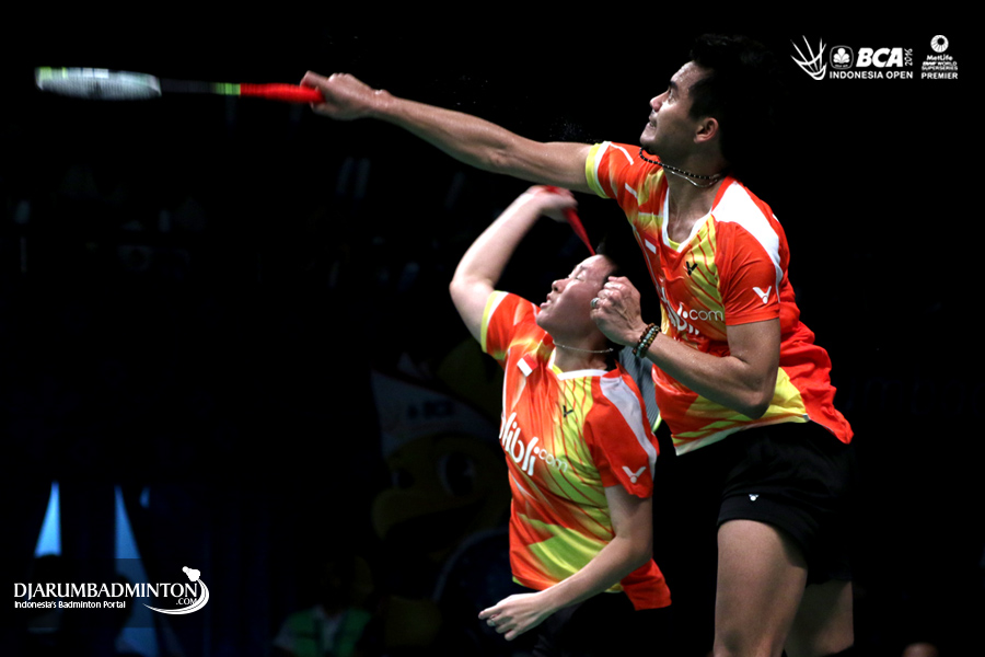 Tontowi Ahmad/Liliyana Natsir (Indonesia) melepaskan serangan