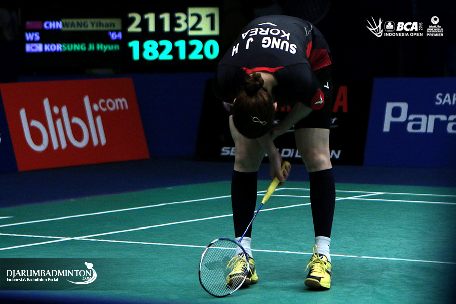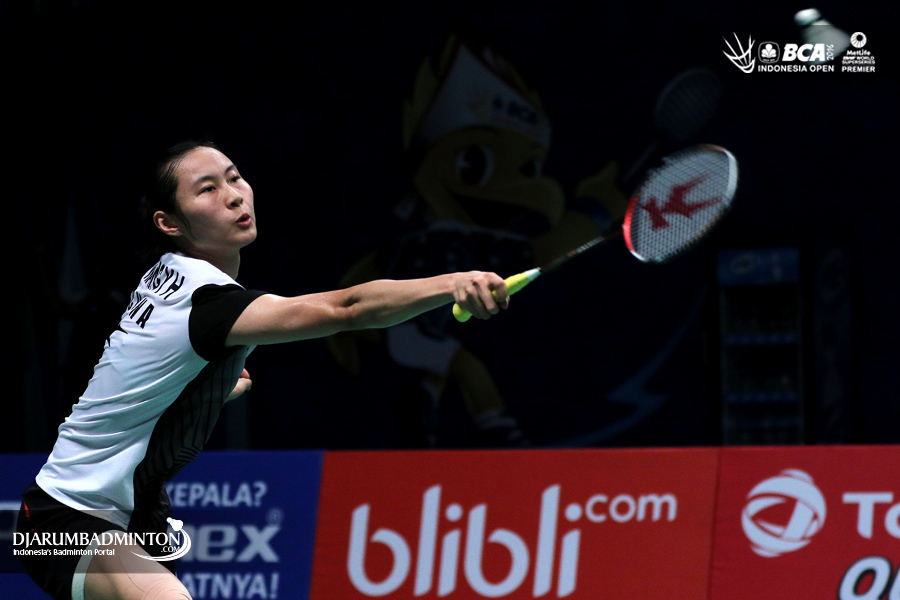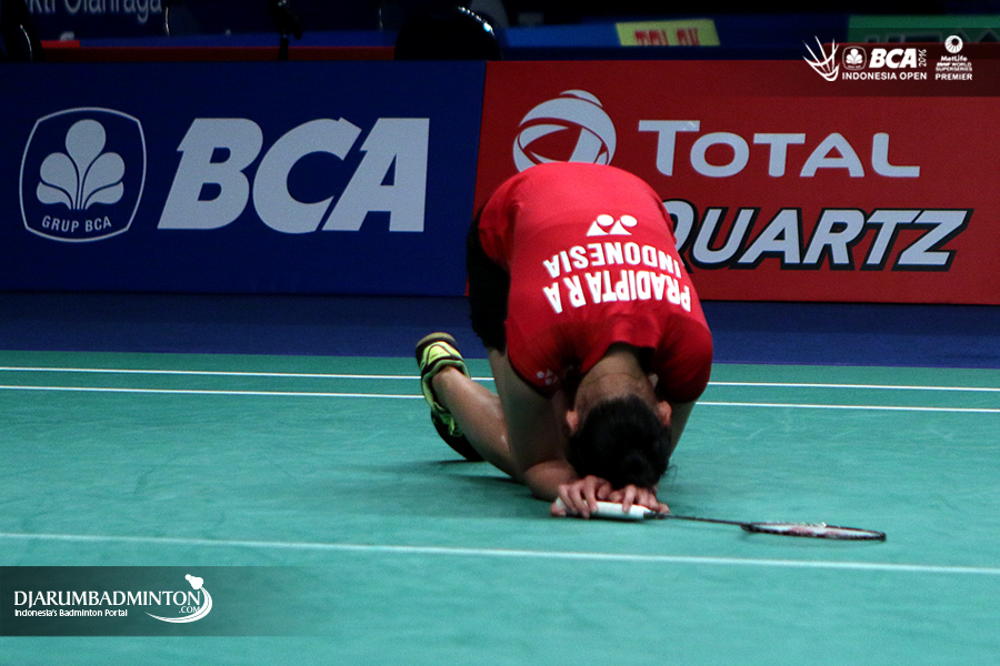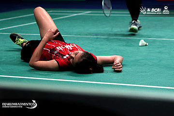 Rizki Amelia (Indonesia) jatuh bangun menyelamatkan pengembalian shuttlecock