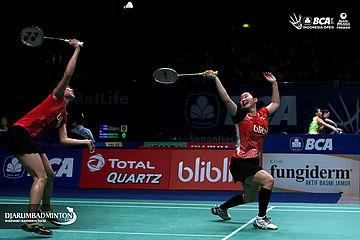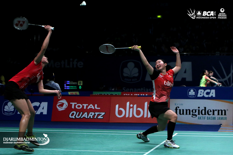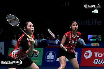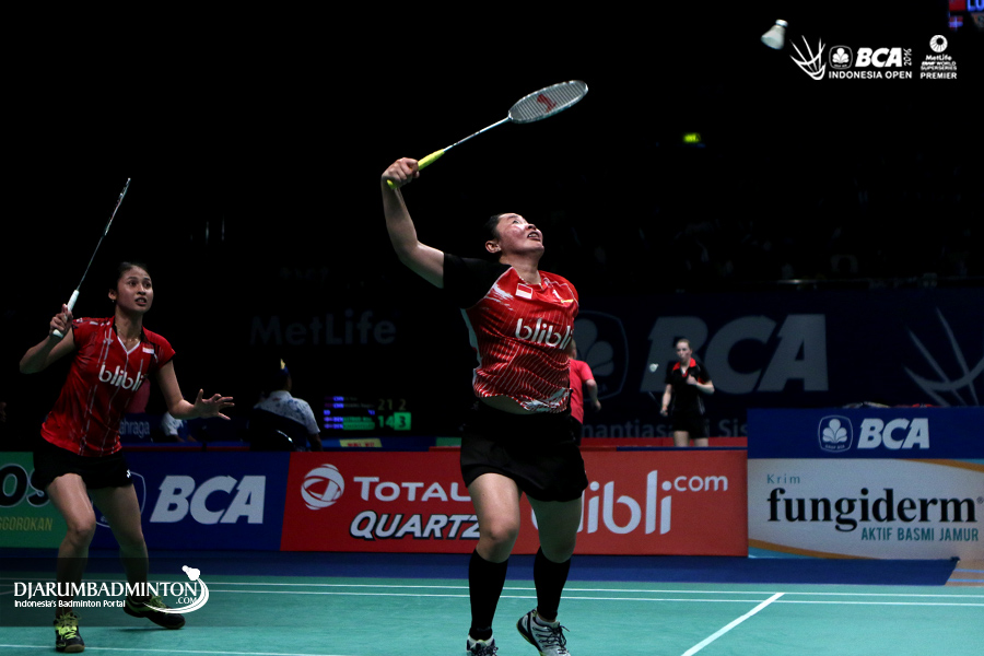 Rizki Amelia/Tiara Rosalia (Indonesia) bersiap menghadang serangan