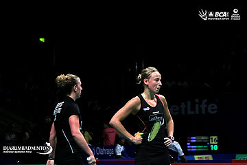 Rizki Amelia/Tiara Rosalia (Indonesia) bersiap menyambut pengembalian