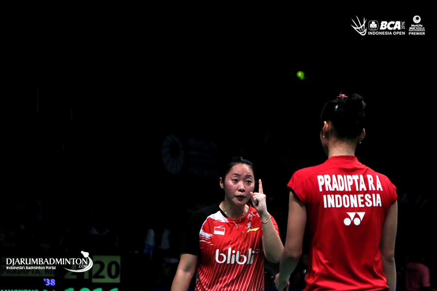 Rizki Amelia/Tiara Rosalia (Indonesia) saling menyemangati satu sama lain
