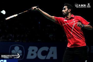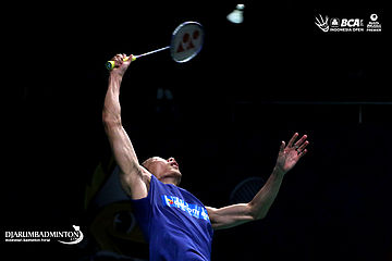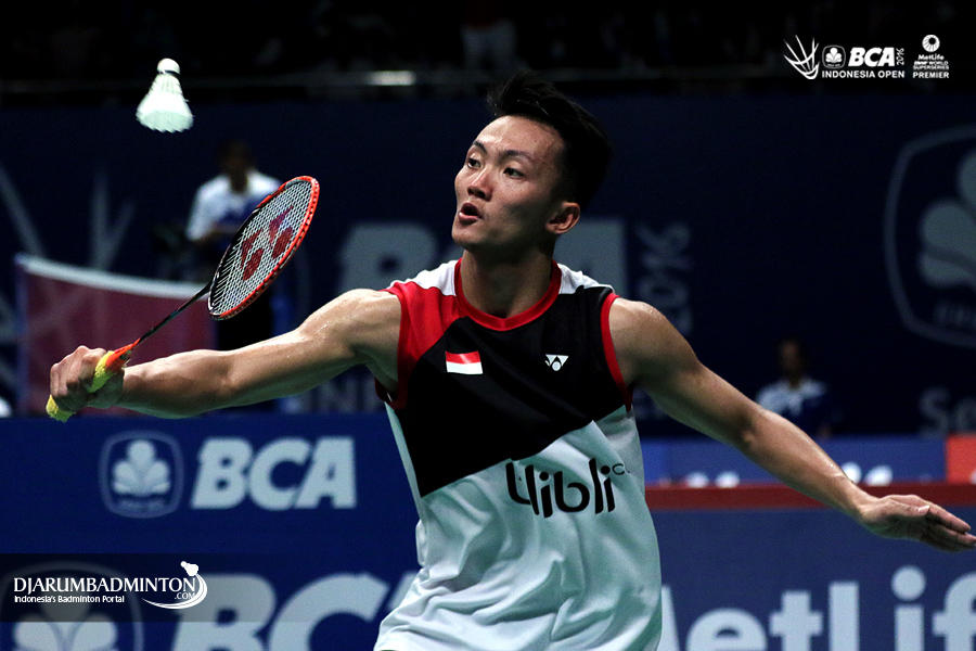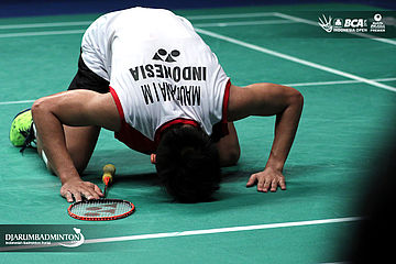 Ihsan Maulana Mustofa (Indonesia) mengembalikan shuttlecock