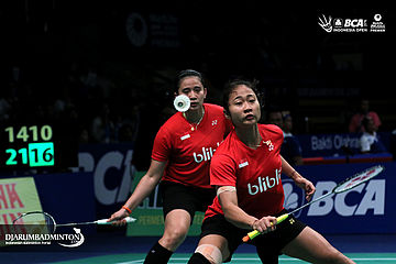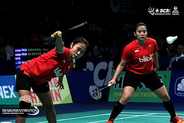 Anggia Shita Awanda/Ni Ketut Mahadewi (Indonesia) menghadang serangan