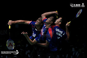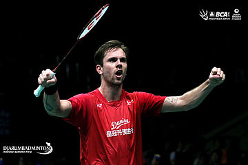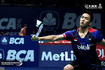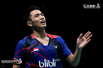 Jonatan Christie (Indonesia) mengembalikan shuttlecock