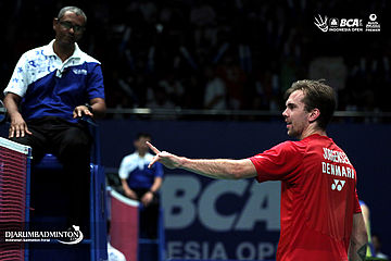 Jan O Jorgensen (Denmark) melakukan protes kepada Umpire