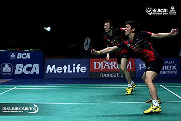 Lee Yong Dae/Yoo Yeon Seong (Korea) menghadang serangan