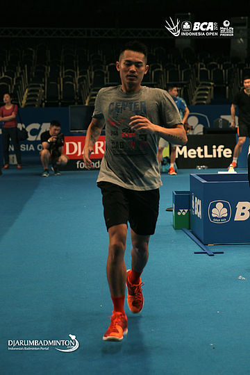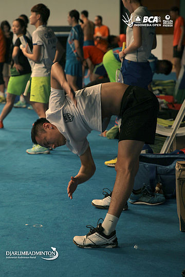 Lin Dan (Tiongkok) melakukan pemanasan sebelum berlatih