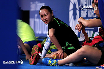 Huang Yaqiong (Tiongkok) melakukan peregangan