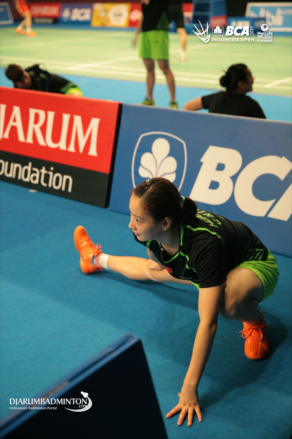 Tang Jinhua (Tiongkok) melakukan peregangan sebelum memulai latihan
