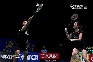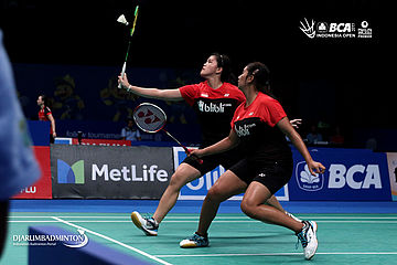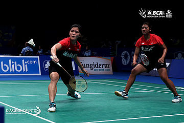 Nisak Puji Lestari/Tania Oktaviani (Indonesia) mengembalikan shuttlecock