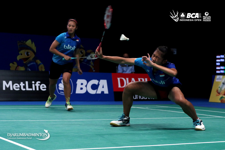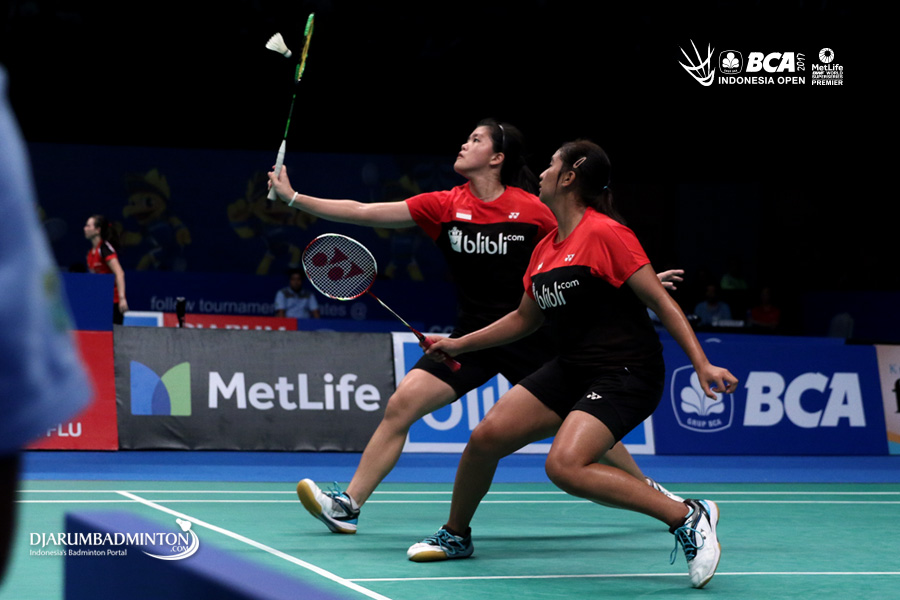 Nisak Puji Lestari/Tania Oktaviani (Indonesia) menghadang serangan.