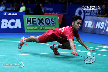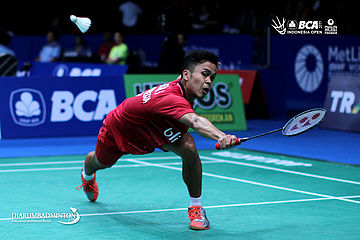 Anthony Sinisuka Ginting (indonesia) berusaha menggapai pengembalian