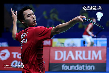 Jonatan Christie (Indonesia) bersiap melepaskan smash