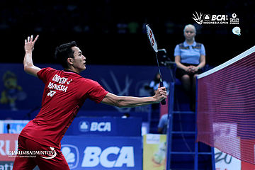 Jonatan Christie (Indonesia) bersiap menyambar pengembalian tanggung