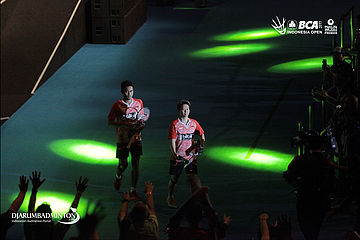 Tontowi Ahmad dan Liliyana Natsir (Indonesia) saat memasuki lapangan pertandingan