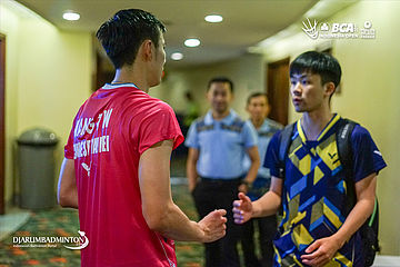 Tzu Wei Wang (Taipei) mendapat pengarahan dari pelatih seusai pertandingan