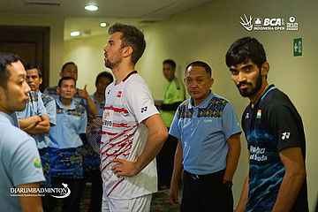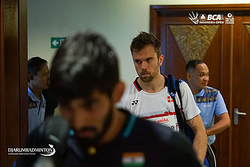 Jan O Jorgensen (Denmark) dan Kidambi Srikanth (India) bersiap memasuki lapangan