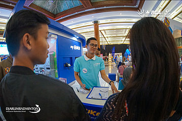 Pengunjung memilih perlengkapan badminton di booth Yonex