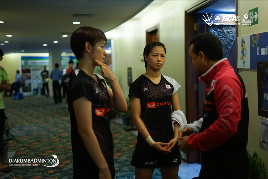 Yuki Fukushima dan Sayaka Hirota (Japang) mendapat pengarahan dari pelatih seusai bertanding