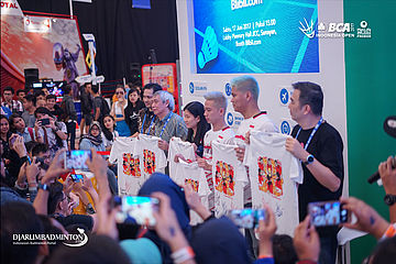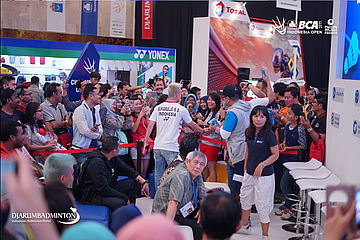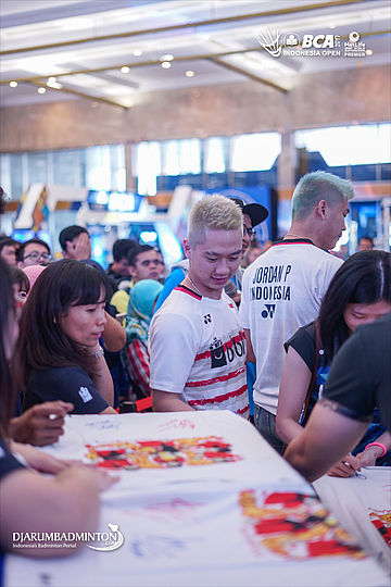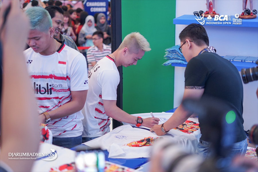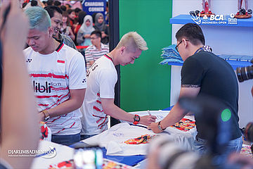 Kevin Sanjaya (Indonesia) menandatangani merchandise di booth Blibli.com