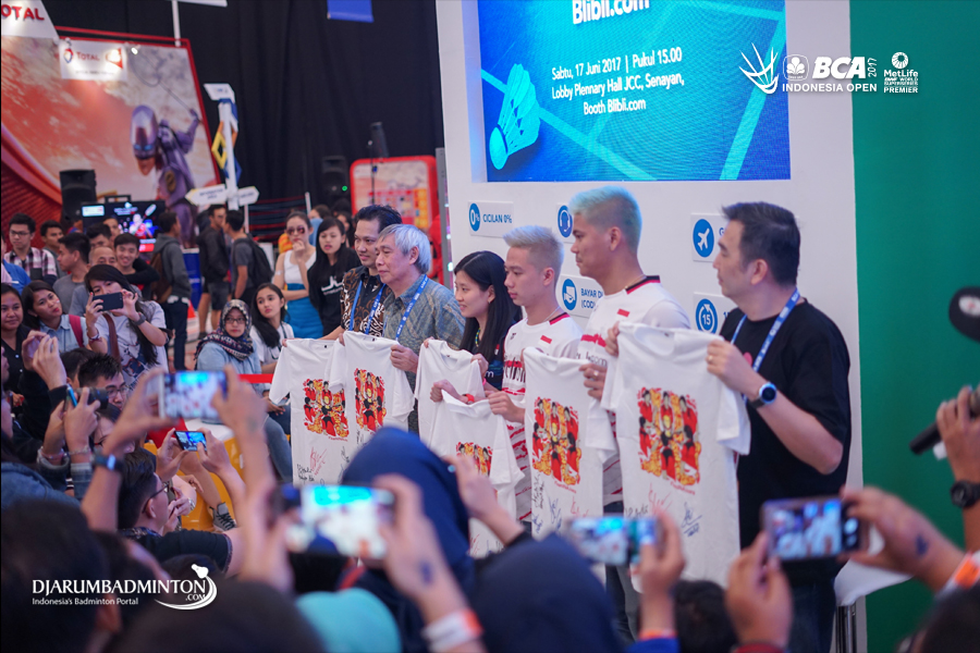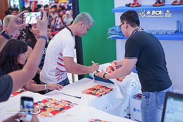 Praveen Jordan (Indonesia) menandatangani merchandise di booth Blibli.com
