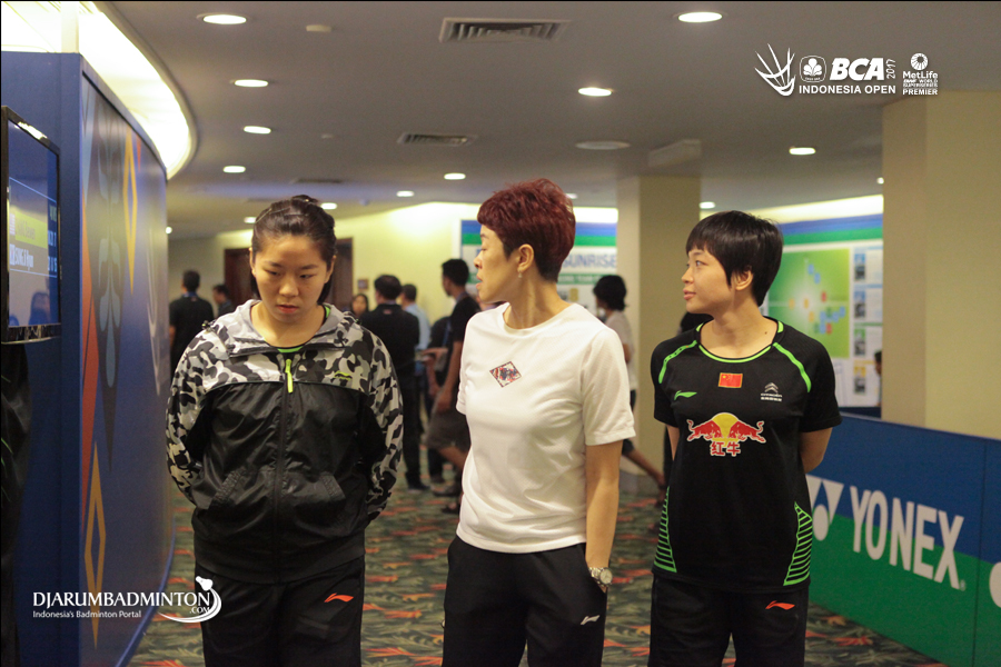 Chen Qingchen dan Jia Yifan (Tiongkok) mendapat pengarahan sebelum bertanding