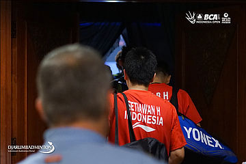 Hendra Setiawan (Indonesia) memasuki lapangan