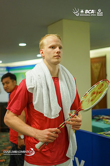 Hendra Setiawan (Indonesia) melakukan pemanasan