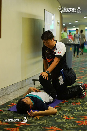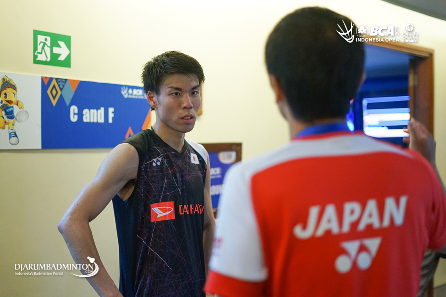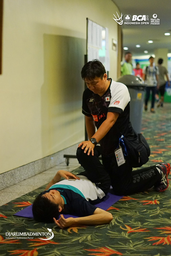 Kazumasa Sakai (Jepang) mendapat pengarahan dari pelatih seusai pertandingan