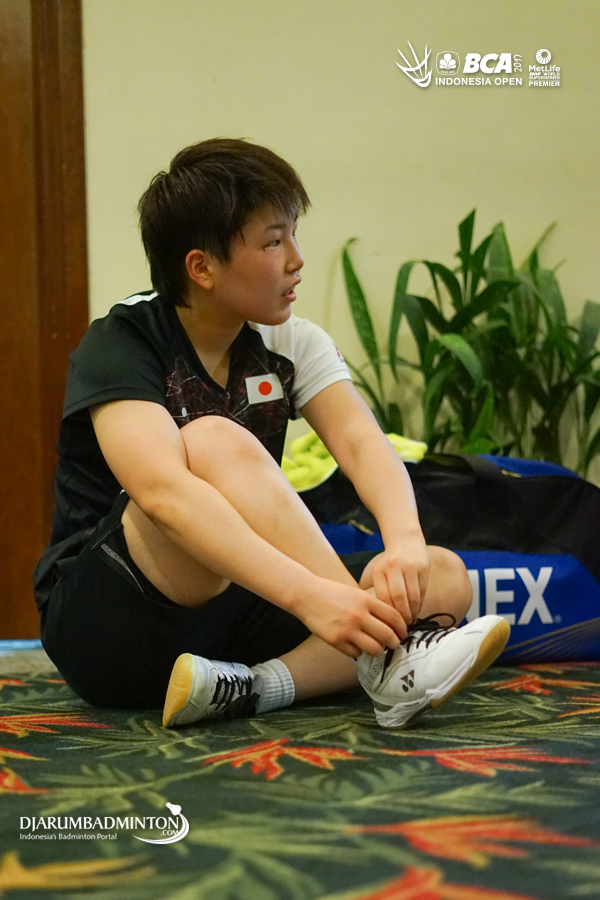 Akane Yamaguchi (Jepang) beristirahat di player lounge setelah bertanding
