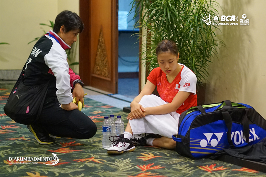 Nozomi Okuhara (Jepang) mendapat pengarahan dari pelatih seusai pertandingan