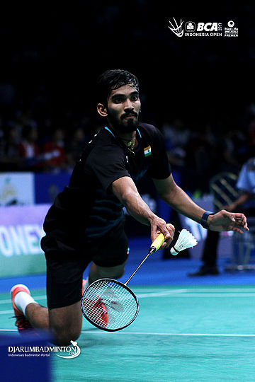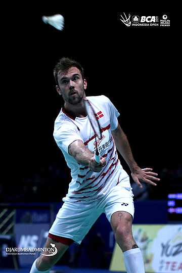 Jan O Jorgensen (Denmark) mengembalikan shuttlecock