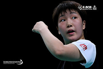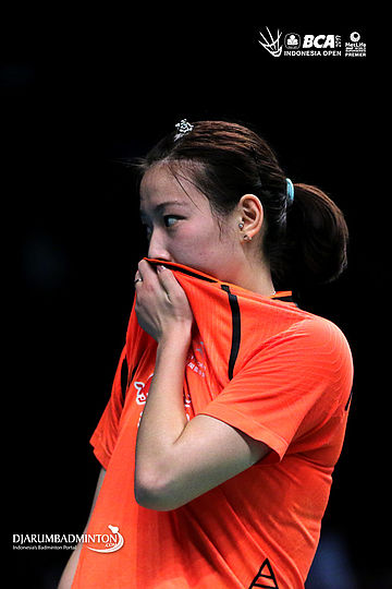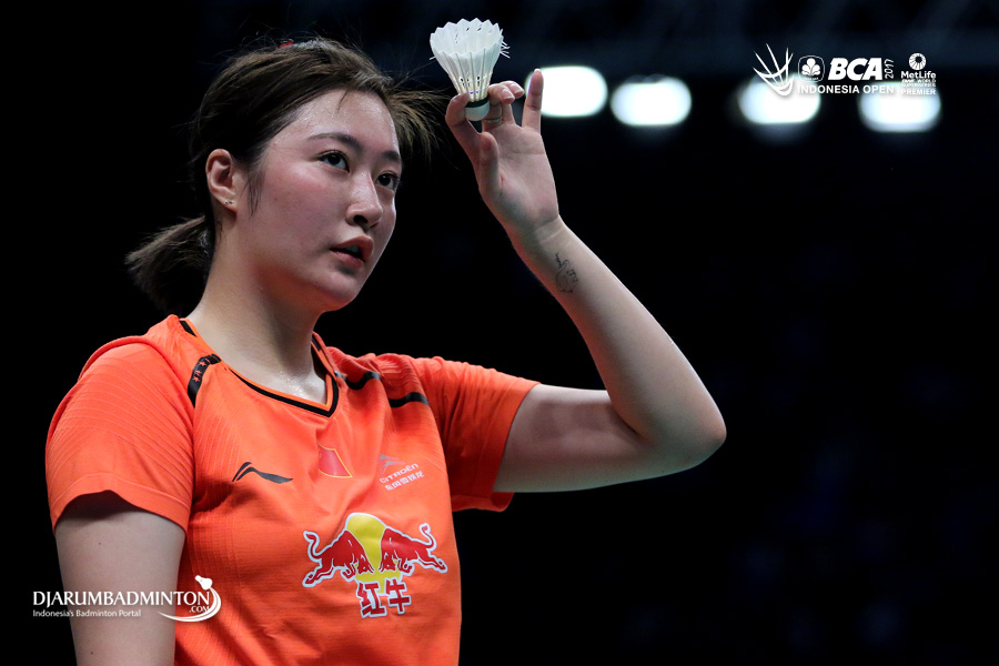 Yu Xiaohan (Tiongkok) meminta pergantian shuttlecock