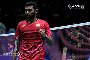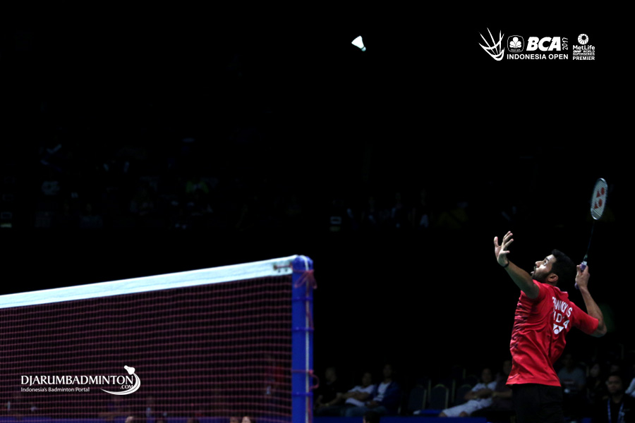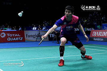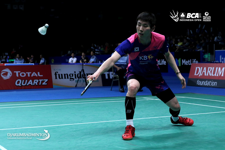 Son Wan Ho (Korea) mengembalikan shuttlecock