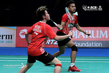 Mathias Boe/Carsten Mogensen (Denamark) bersiap menyambar pengembalian