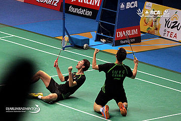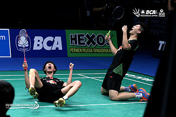 Selebrasi kemenangan Li Junhui/Liu Yuchen (Tiongkok)