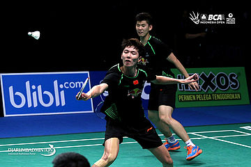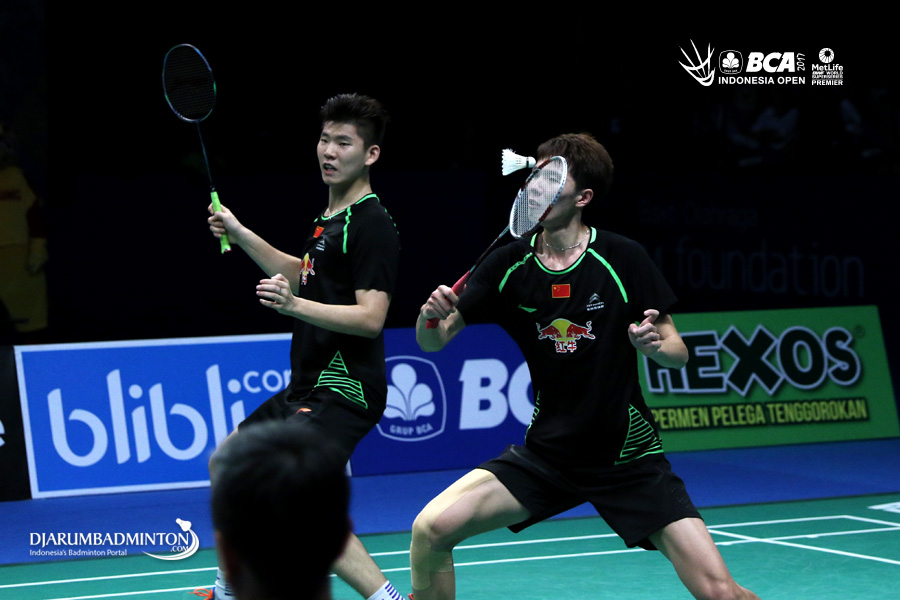 Li Junhui/Liu Yuchen (Tiongkok) mengembalikan shuttlecock