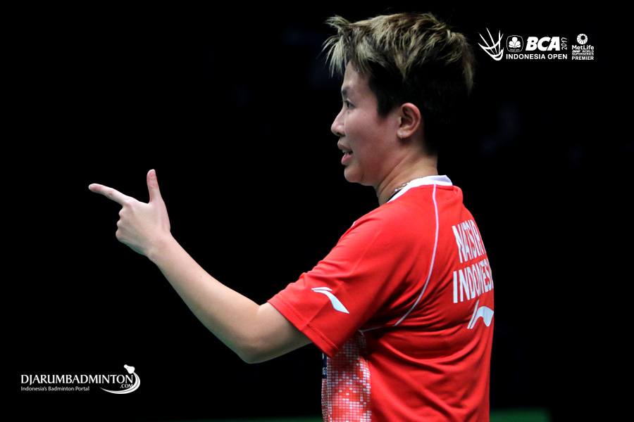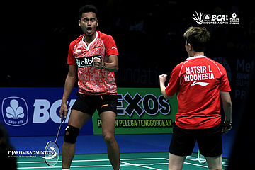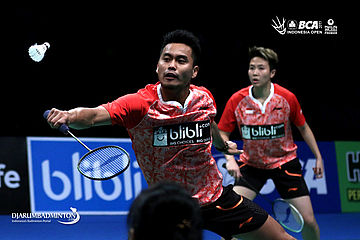 Tontowi Ahmad/Liliyana Natsir (Indonesia) saling berkoordinasi di lapangan
