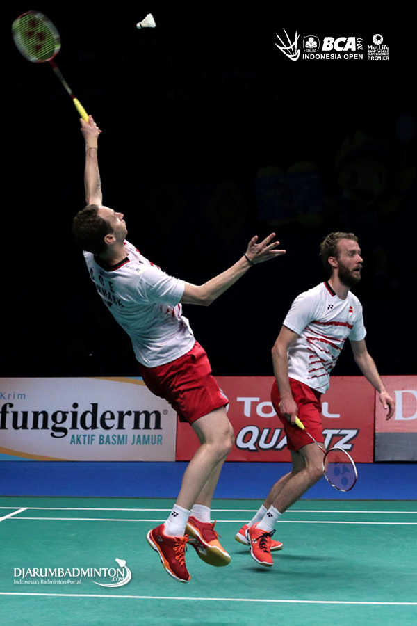 Mathias Boe/Carsten Mogensen (Denamark) bersiap menyambar pengembalian
