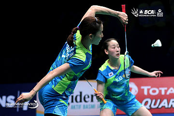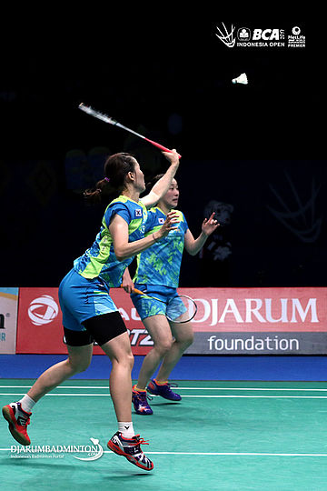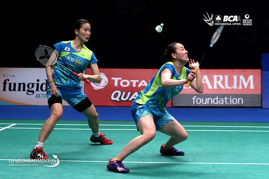 Chang Ye Na/Lee So Hee (Korea) bersiap menyambar pengembalian
