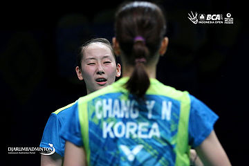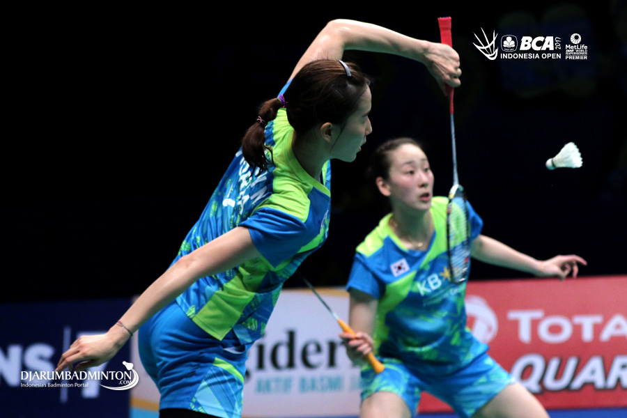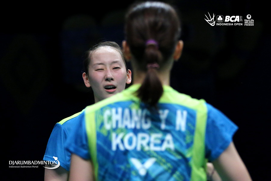 Chang Ye Na/Lee So Hee (Korea) bersiap menghadang serangan